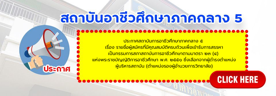 ประกาศสถาบันการอาชีวศึกษาภาคกลาง ๕ เรื่อง รายชื่อผู้สมัครที่มีคุณสมบัติครบถ้วนเพื่อเข้ารับการสรรหา เป็นกรรมการสภาสถาบันการอาชีวศึกษาตามมาตรา ๒๓ (๔) แห่งพระราชบัญญัติการอาชีวศึกษา พ.ศ. ๒๕๕๑ ซึ่งเลือกจากผู้ดำรงตำแหน่ง ผู้บริหารสถาบัน (ตำแหน่งรองผู้อำนวยการวิทยาลัย)